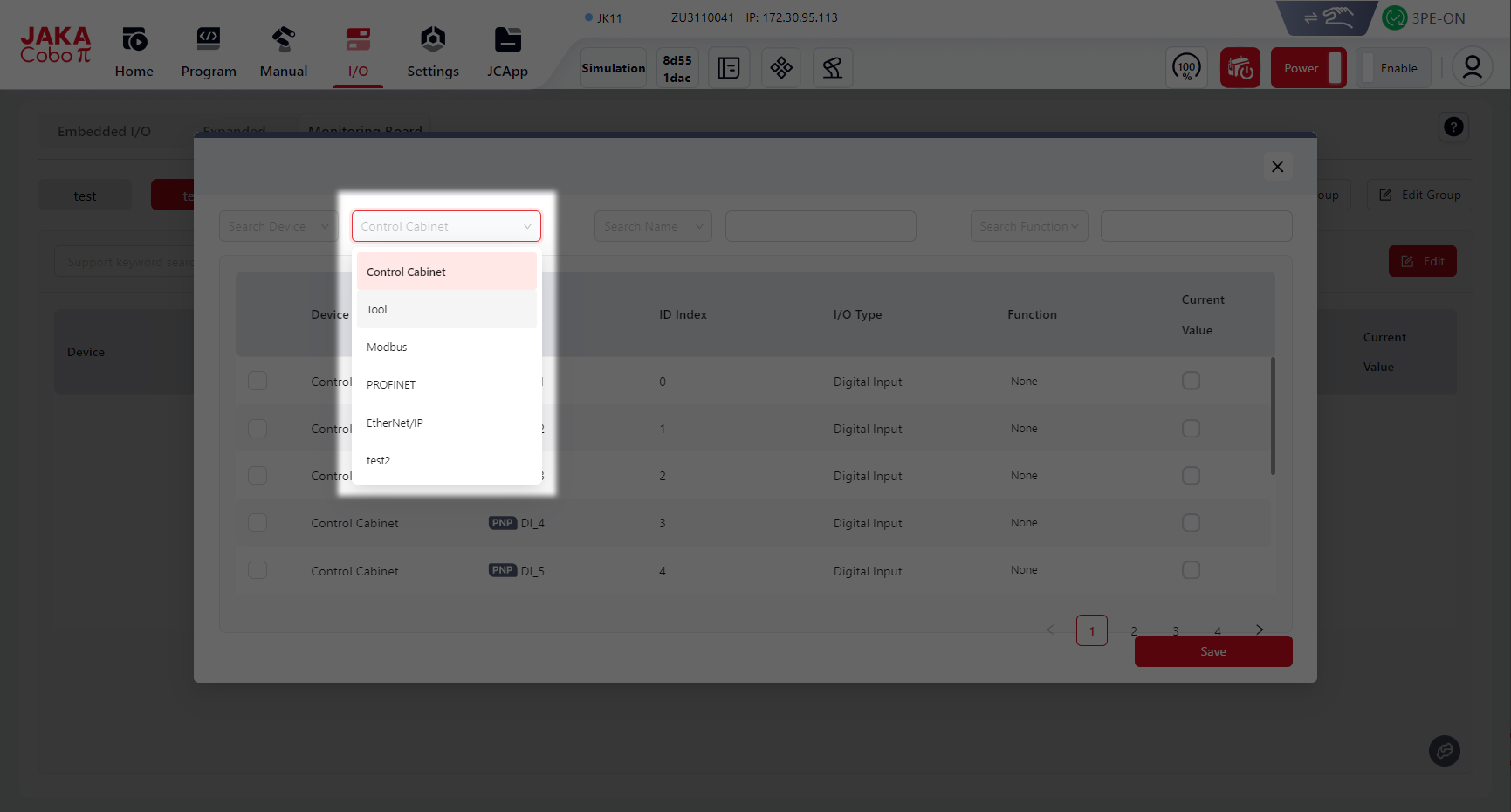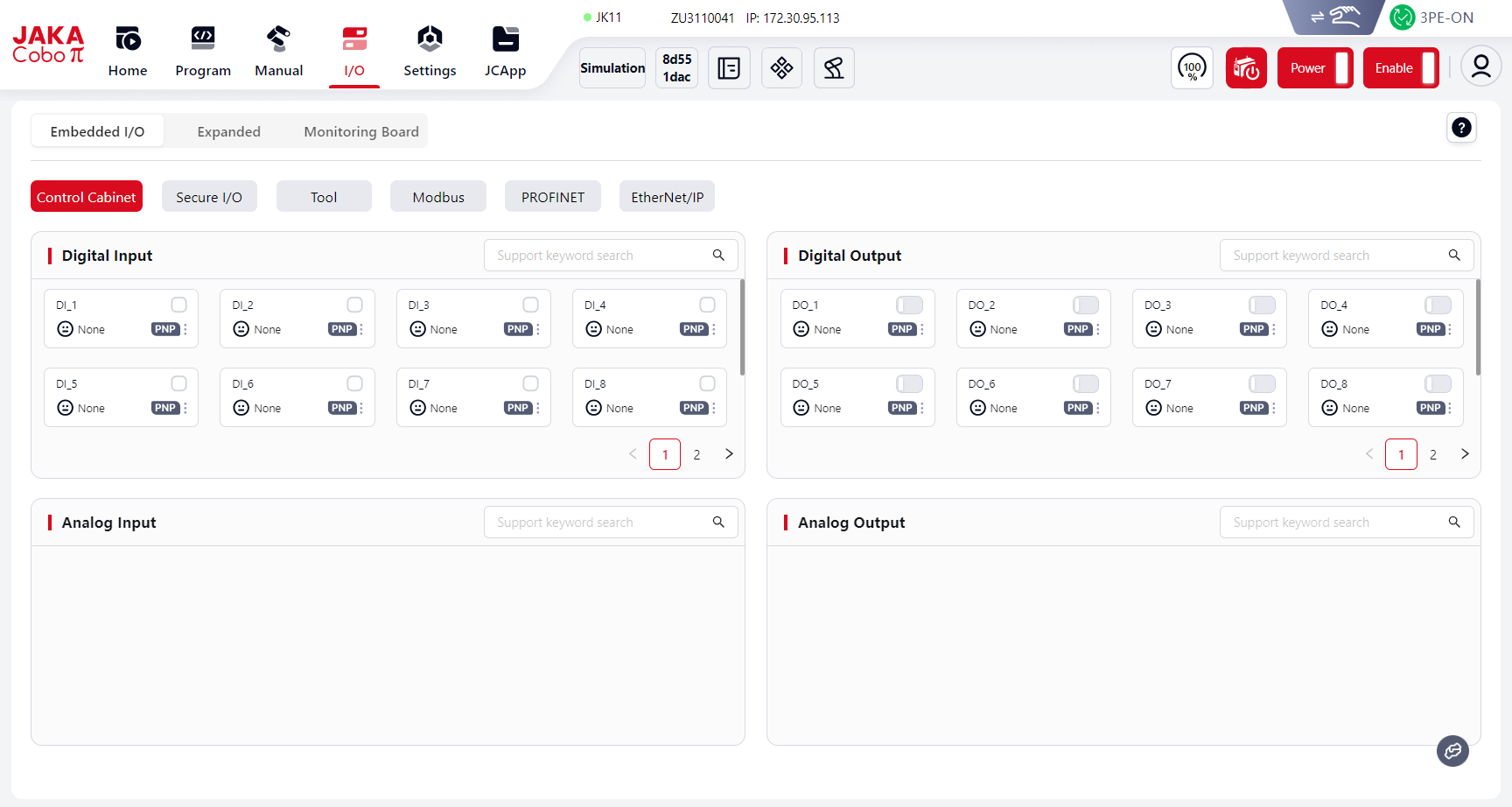 Users can view and configure the electrical I/O of the robot control cabinet in the I/O panel.