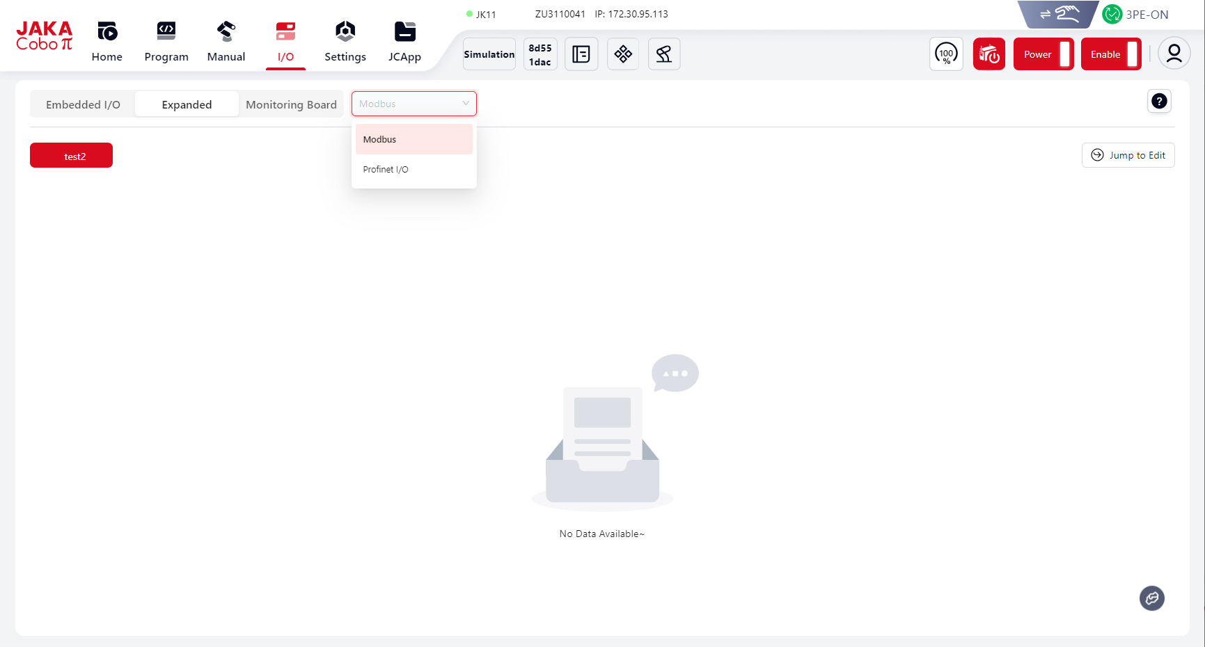 The JAKA robot control cabinet supports the Modbus protocol. It can act as a Modbus slave to communicate with external devices.
