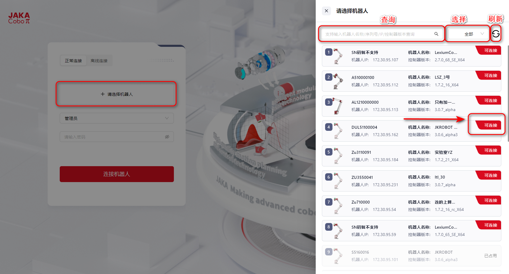 后,在页面右侧跳出的列表中选择任意可连接的机器人;