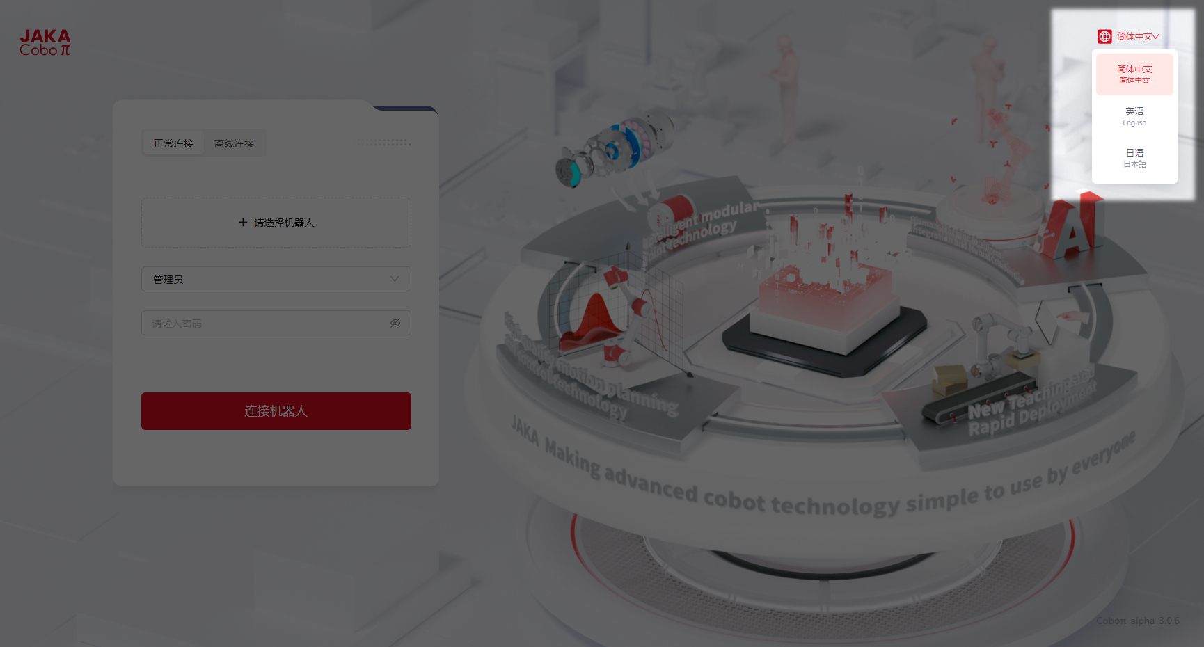 点击页面右上角图标可切换语言,目前Coboπ支持: