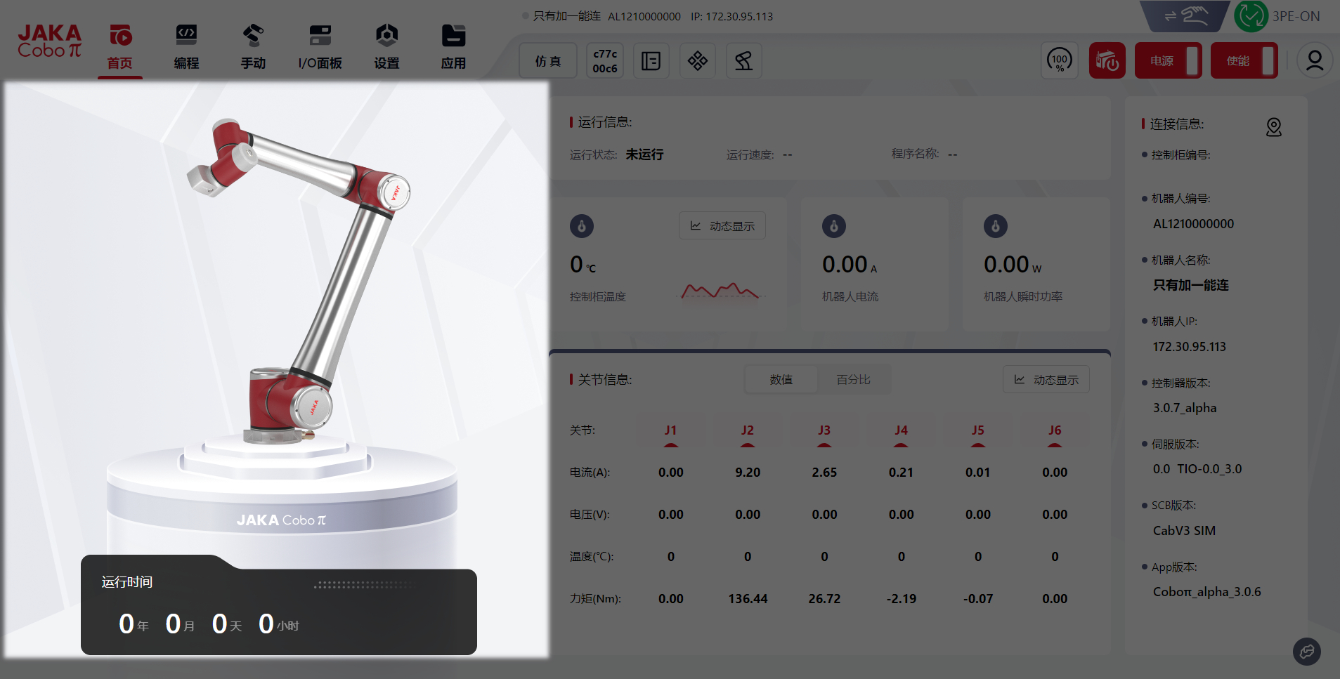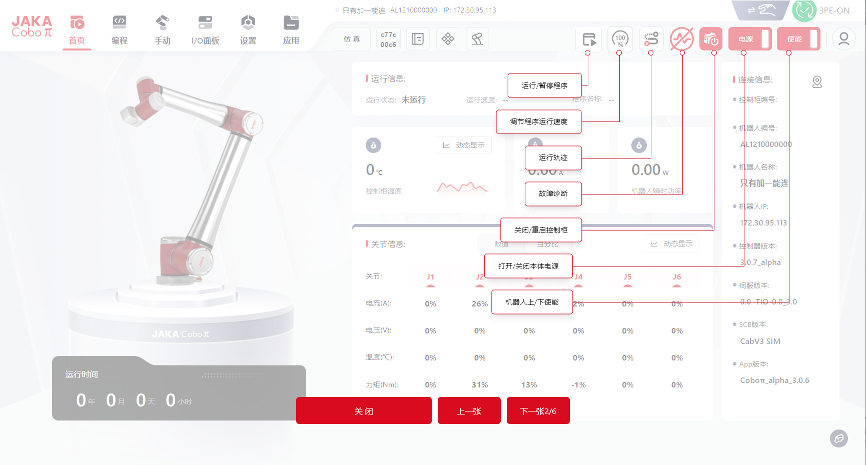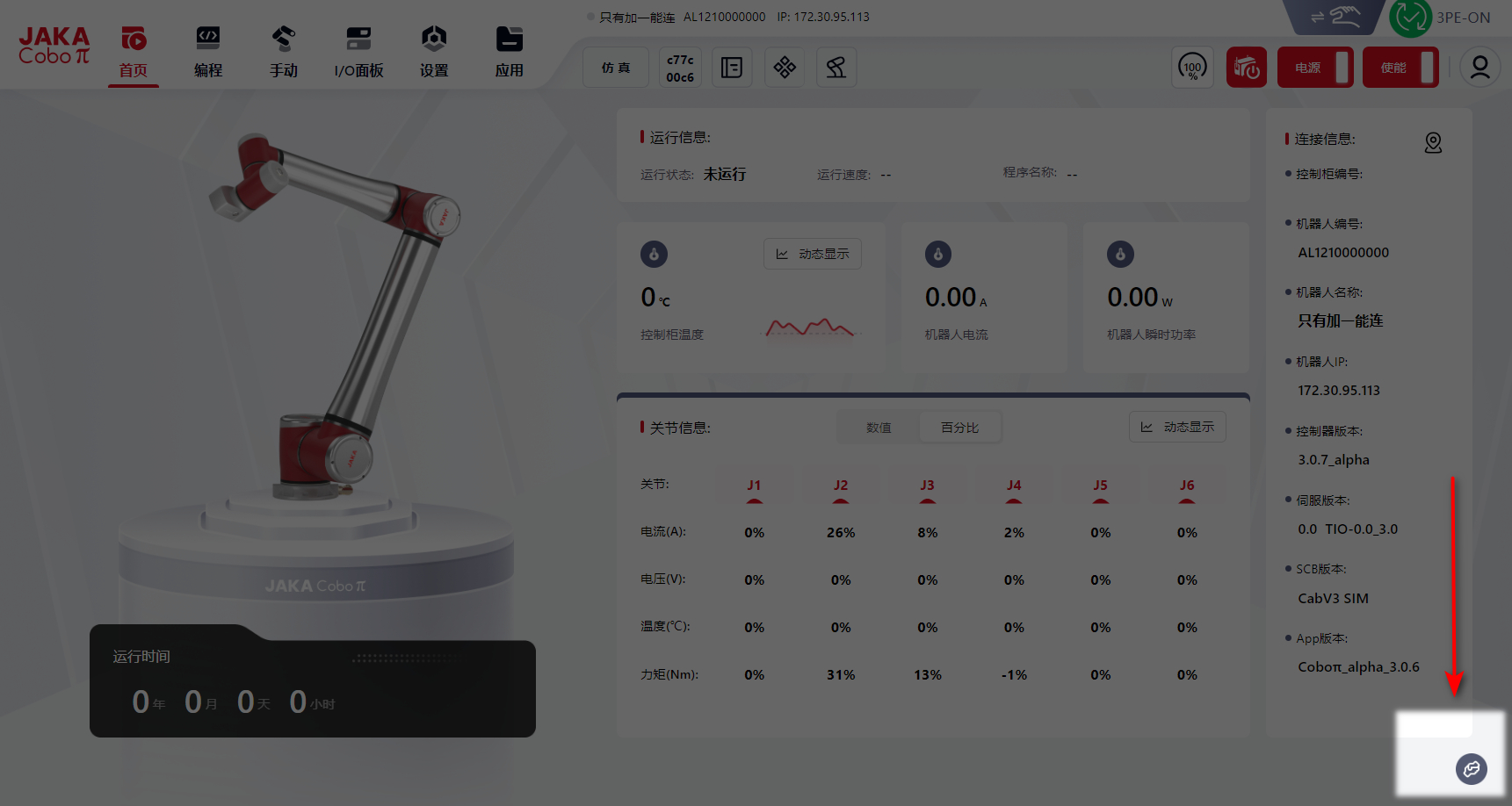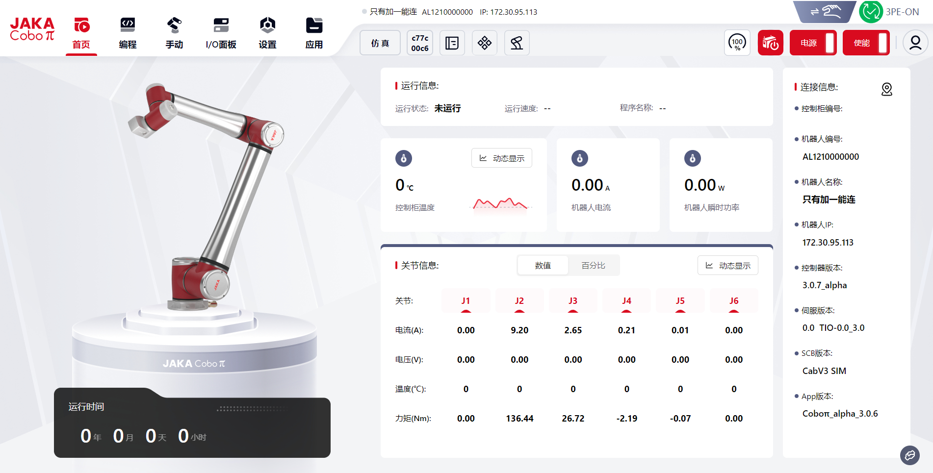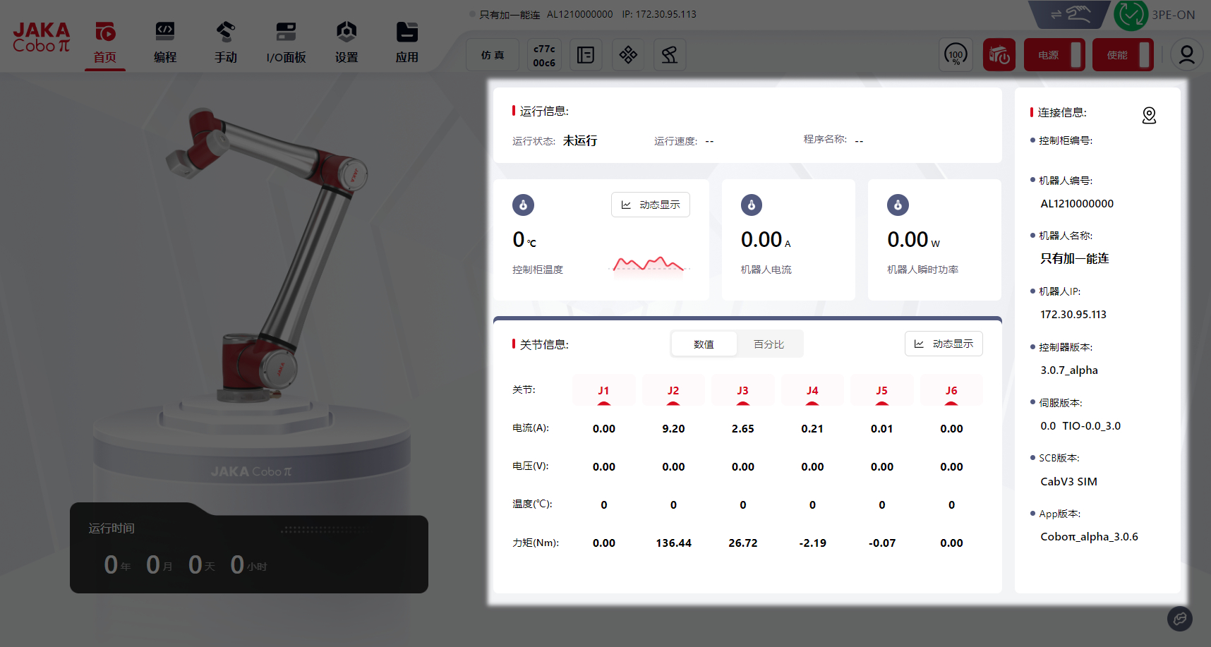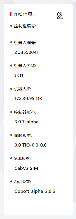 此处会显示机器人控制柜编号、机器人编号、名称、IP信息以及所用控制器、伺服、SCB及Coboπ的版本信息。
