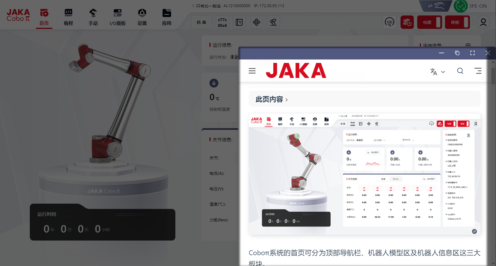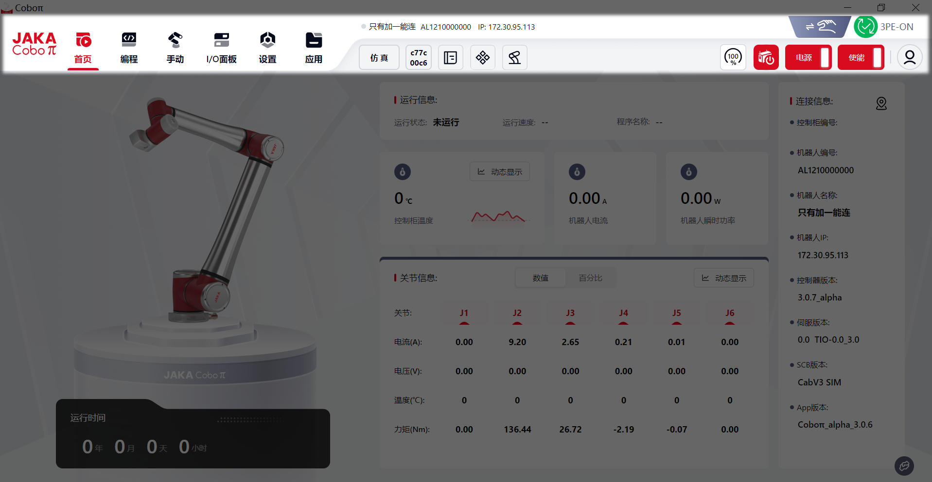 为方便介绍,本手册将Coboπ系统首页分为顶部导航栏、机器人模型区、机器人信息区这三大部分。