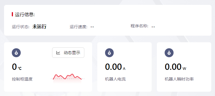 此处显示了机器人当下的程序运行状态,包括是否有程序在运行中、所运行程序的名称及速度。以及机器人控制柜温度、机器人电流及机器人瞬时功率。