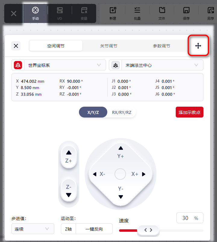 - 用法:选择工具坐标系,机器人末端位姿相对于工具坐标系;选择世界坐标系,机器人末端位姿相对于机器人基坐标系。