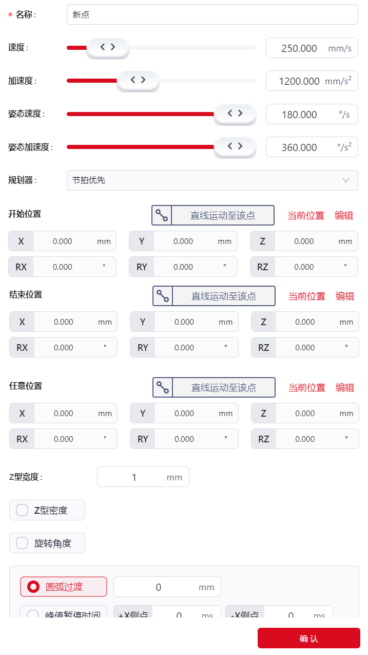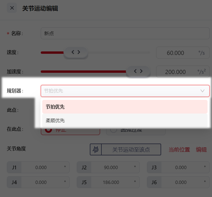 - 柔顺优先:机器人加减速时呈S型曲线变化,加速度变化率保持恒定。使用柔顺优先,机器人运动轨迹更顺滑,对机器人的冲击较小。一般用于节拍要求不高、轨迹精度要求高的场景。柔顺优先在编程控制机器人并运行程序时生效,在手动操作界面、拖拽模式和关节运动/直线运动至该点时不生效。