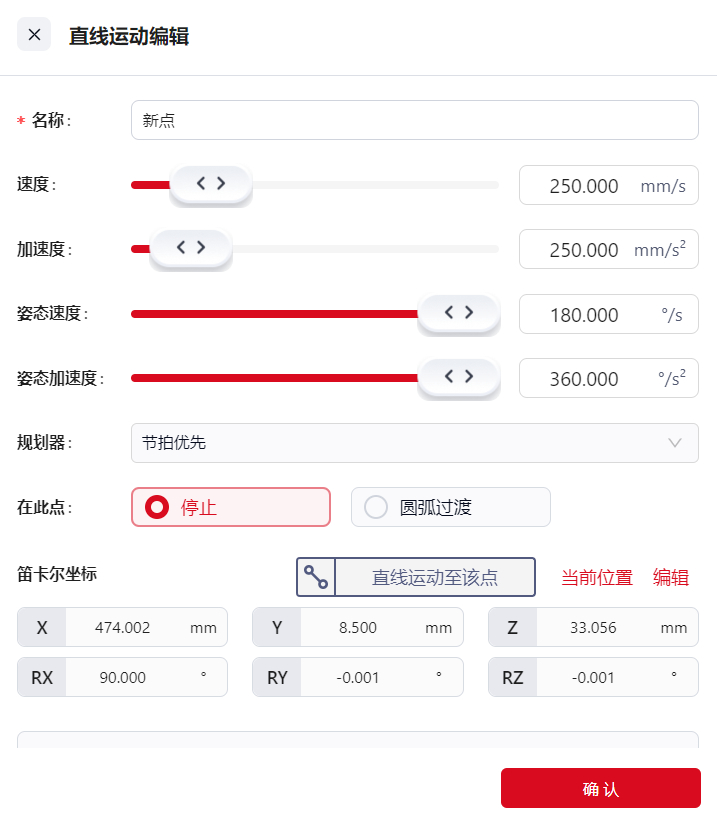 - 使用笛卡尔坐标系记录的点位使机器人关节运动。