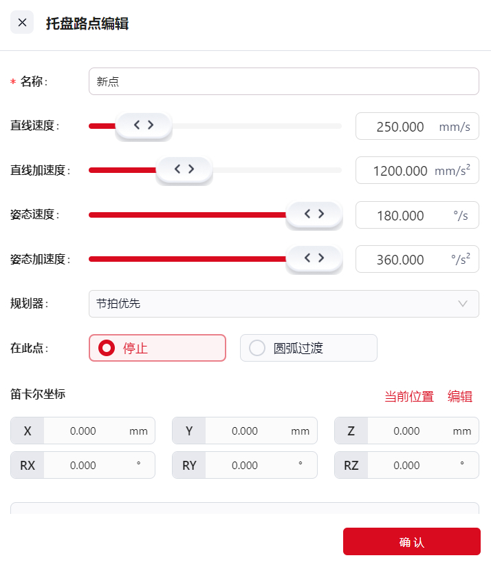 可打开手动操作页面,编辑示教点位;也可直接拖拽机器人至想要点位后,点击关节角度