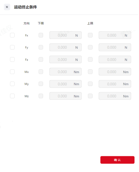 - 用法:勾选需要监测的方向,设定上限值或下限值;当接触外力值小于下限值时或者大于上限值时,触发运动终止条件。此条指令监测紧邻的下一条运动指令,如果触发运动终止条件,机器人会立刻从当前位置运动到下一条运动指令的设定位置。