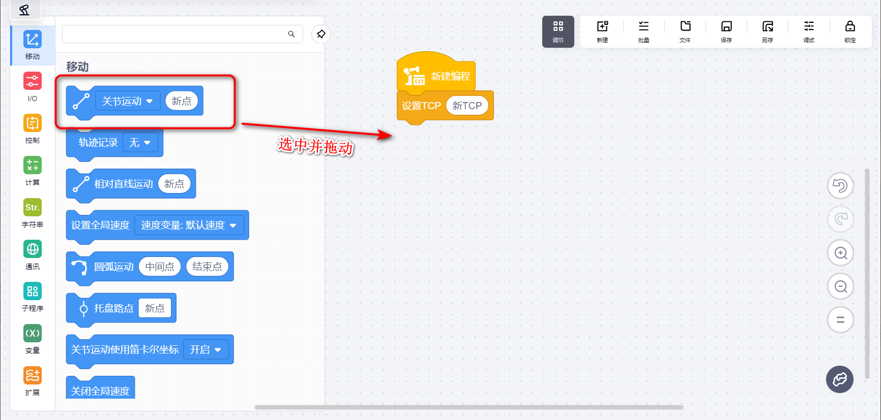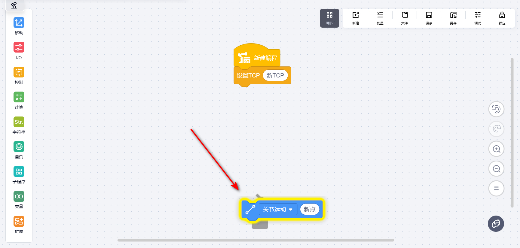 中选中任意指令后,拖拽至空白画布中,即可进行指令拼接: