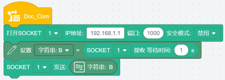 在下拉列表中选择指定的SOCKET ID,拖入变量或输入数值,执行此指令,TCP server会接收到此变量的内容,并获得返回值。若发送成功,会返回发送的数据长度;若发送失败,则返回-1。