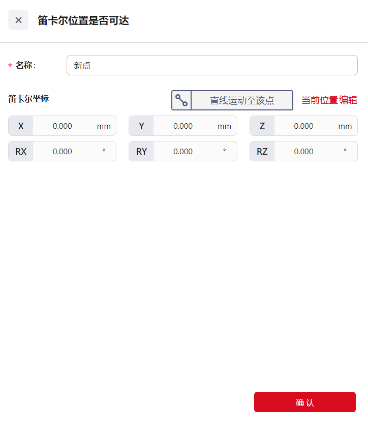 名称速度加速度姿态速度姿态加速度, 选择节拍优先或柔顺优先,选择在此点停止或圆弧过渡,选择指令跳过条件。在笛卡尔坐标-编辑可打开手动操作页面,编辑示教点位;也可直接拖拽机器人至想要点位后,点击笛卡尔坐标-当前位置,此时机器人各坐标的具体值即可显示在界面中。