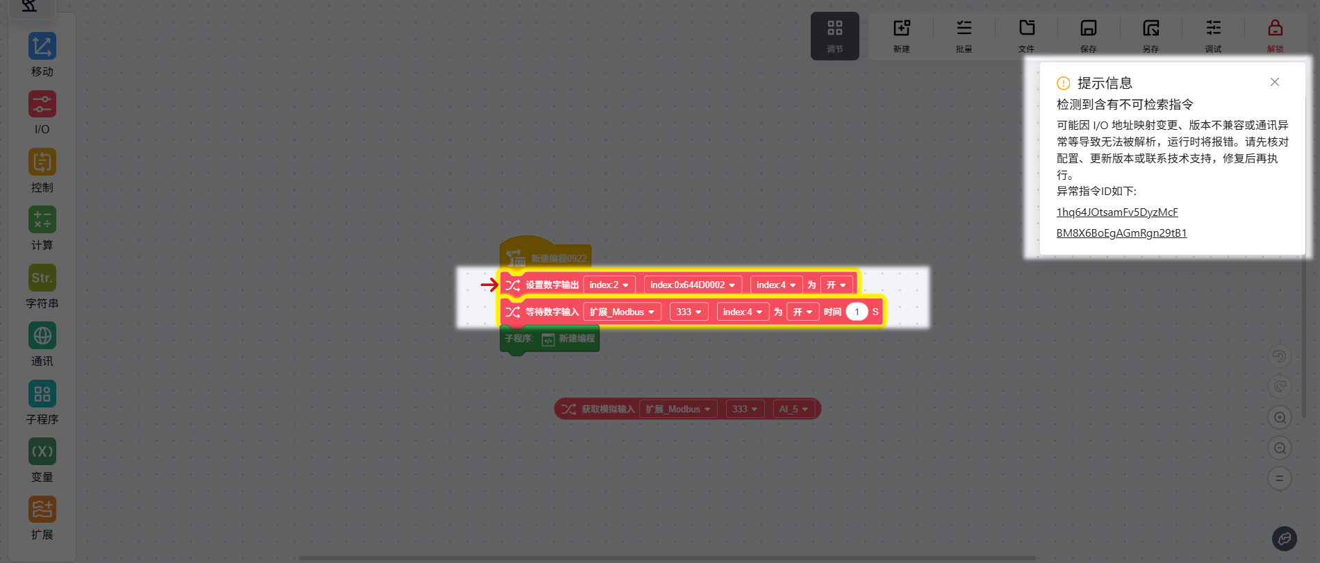 保存程序时,如果当前页面的程序里包含某条异常指令,则在页面的右上方将会出现一条提示信息,与此同时,程序中的异常指令会高亮显示,指令前面会有箭头指示。