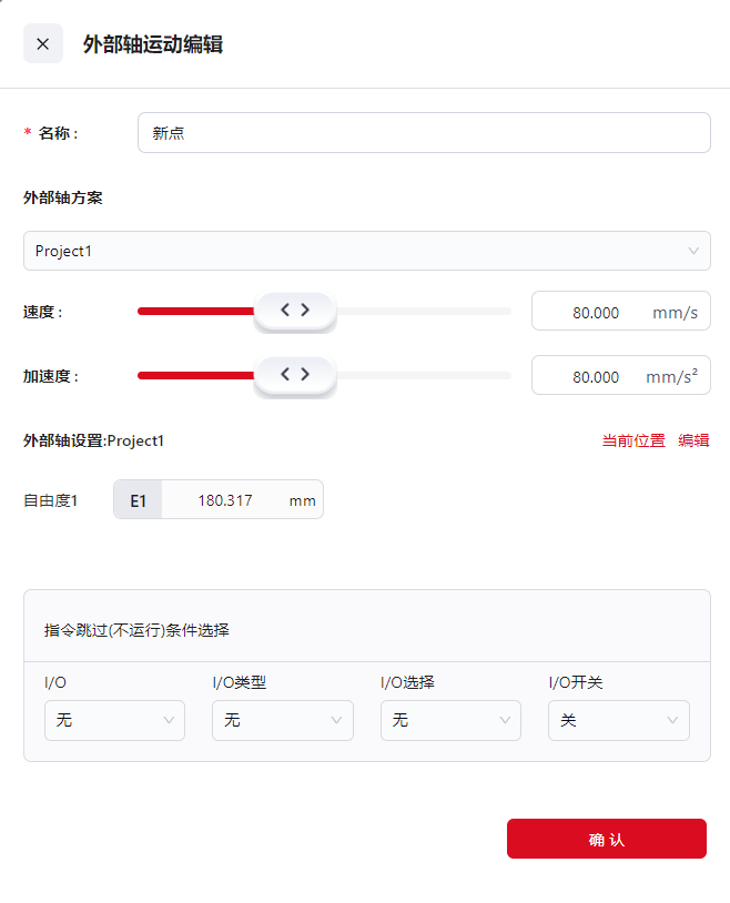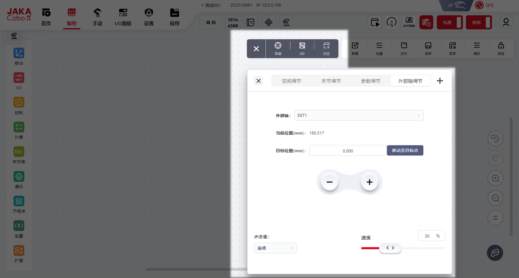 当机器人连接了外部轴时,此处会出现外部轴手动操作界面,用户可直接进行操作。