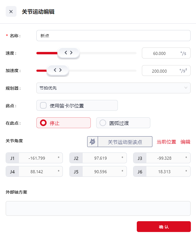 名称速度加速度, 选择节拍优先或柔顺优先,选择是否使用笛卡尔位置在此点停止或圆弧过渡,选择指令跳过条件。在关节角度-编辑可打开手动操作页面,编辑示教点位;也可直接拖拽机器人至想要点位后,点击关节角度-当前位置,此时机器人各关节的具体角度即可显示在界面中。