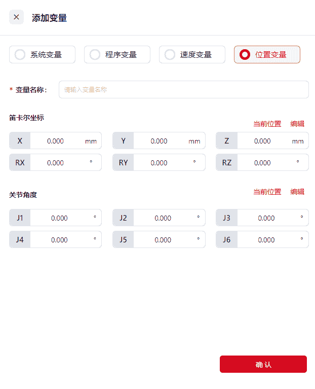 位置变量可以设定机器人笛卡尔位置和关节位置,可直接在框内输入数值,也可点击 编辑