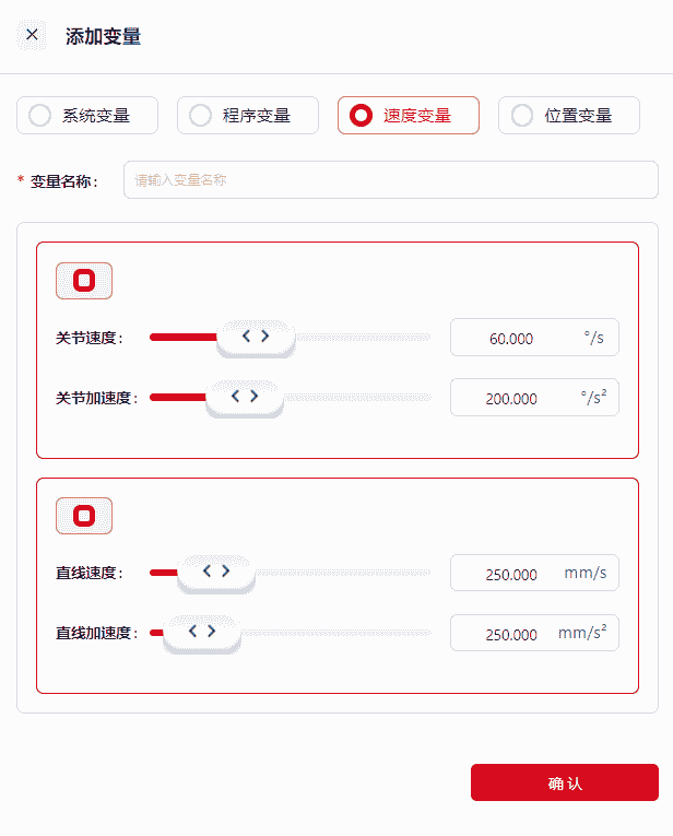 速度变量也可以通过SOCKET指令发送,发送内容为关节速度、关节加速度、直线速度和直线加速度。