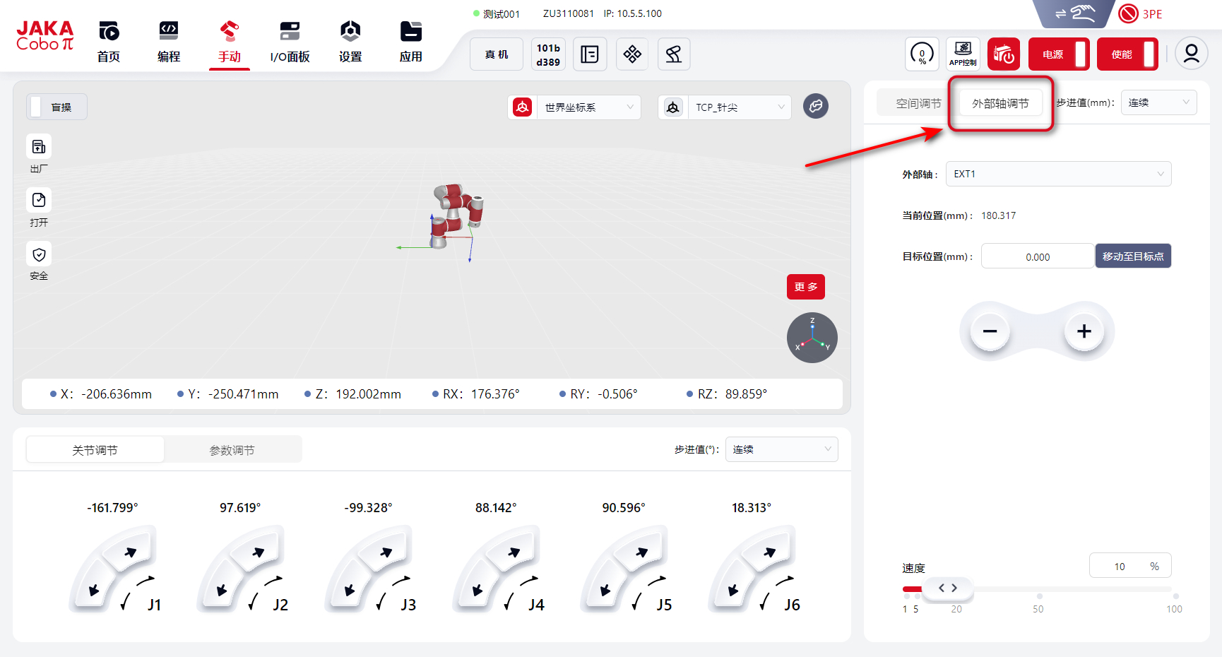 当接入外部轴后,此处会显示外部轴调节的页面,用户可在该页面里手动控制外部轴。