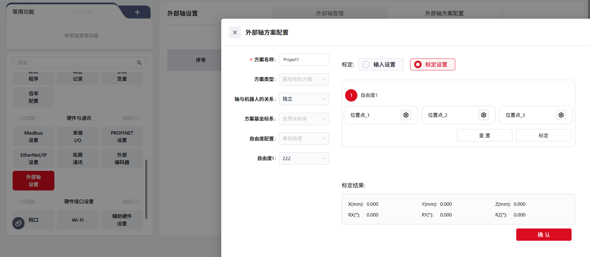标定设置,参考示意图,跳转至手动界面移动机器人及外部轴到合适点位,在下方的框里确认标定结果,点击确认,完成配置。