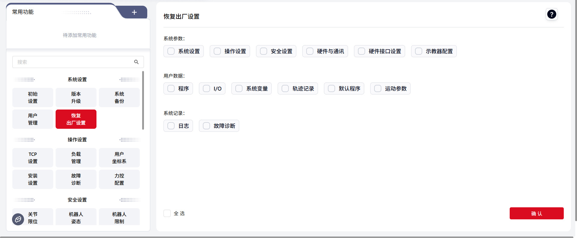 在该界面,用户可自行选择想要恢复出厂设置的选项,也可点击左下方的 全选 按钮,还原列表中所有选项的设置。