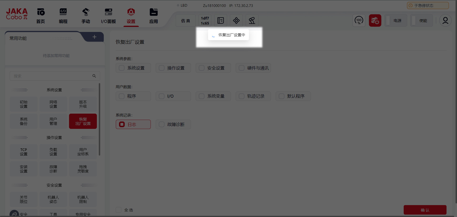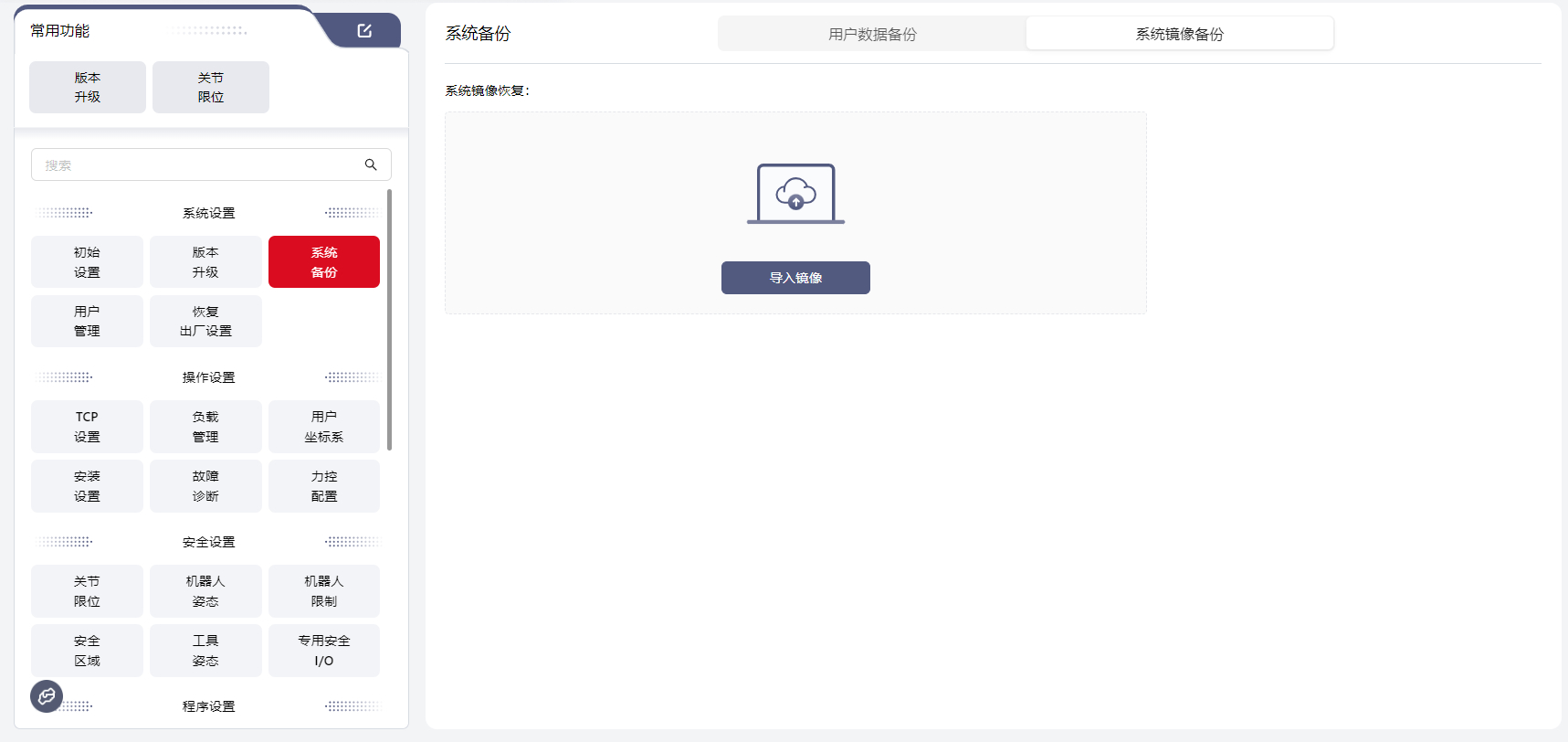出于信息安全考虑,仅支持系统镜像恢复功能,且必须为节卡提供的标准镜像。
