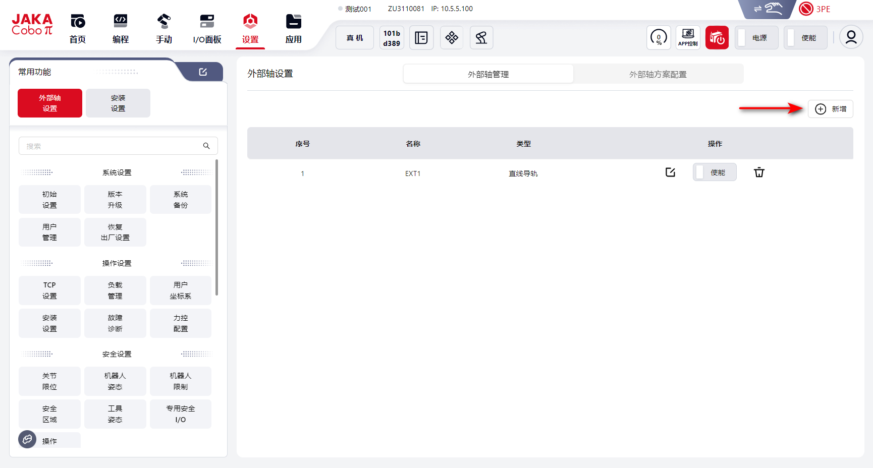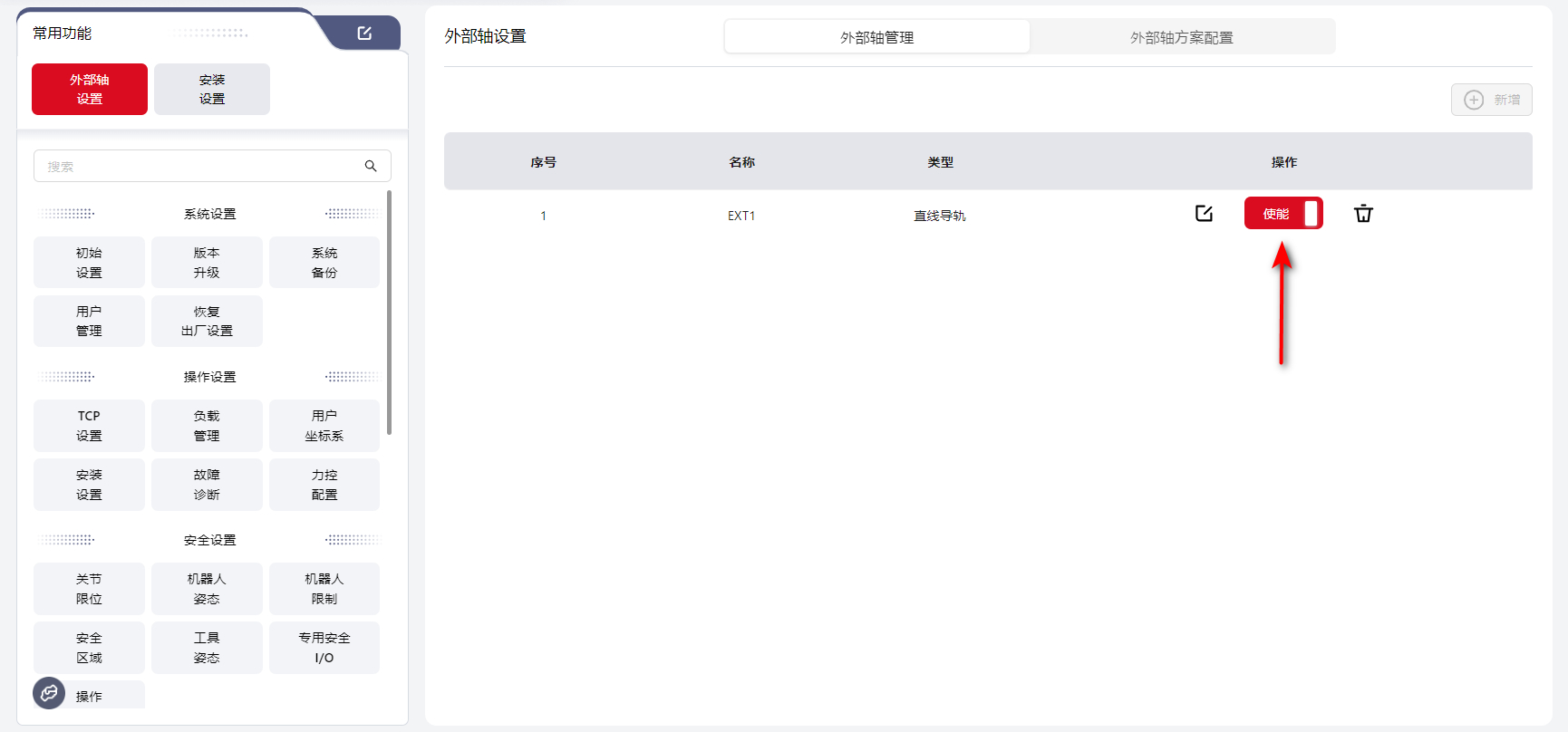 重启后,上电上使能,点击使能,使能成功后可使用外部轴。