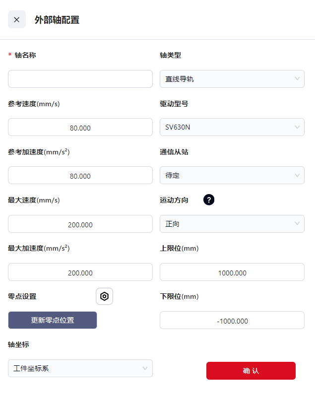 点击新增,在弹出的页面中设置轴名称、轴类型、参考速度、驱动型号、参考加速度、通信从站、最大速度、运动方向、最大加速度、上限位、零点设置、下限位及轴坐标,设置好后,点击确认。