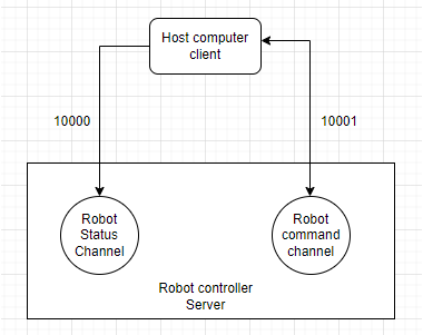 A TCP server runs on the robot controller to receive user-defined commands and feedback status data. The server communicates with external clients using ports 10000 and 10001, as follows: