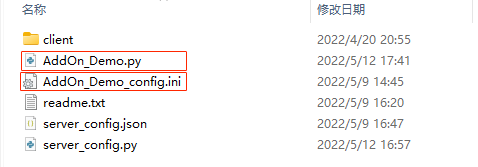 首先准备一个JAKA Addon开发的demo(见下面链接,可获取下载),解压缩后有以下目录及文件,其中最主要的是红框标出来的两个文件,Addon_Demo.py为Python主程序,是整个Addon运行时的入口程序。Addon_Demo_config.ini为Addon配置文件,里面是关于此Addon的一些配置项。