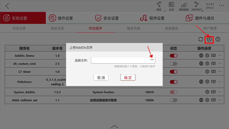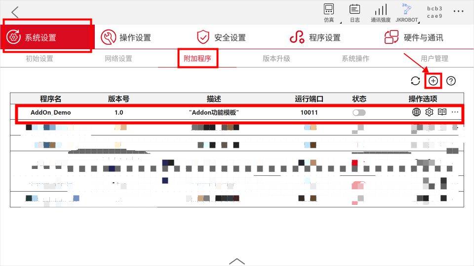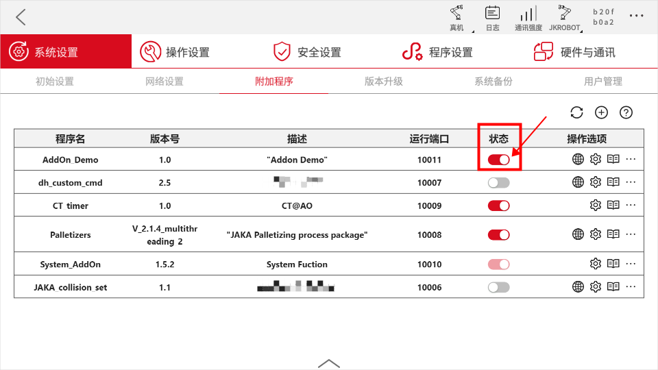 用户编写完Addon后需要将项目打包成tar.gz格式,形成Addon软件包。然后打开JAKA App软件,用户可通过[设置]-->[系统设置]-->[附件程序],进入附加程序管理界面,上传该Addon包后即可完成安装。安装完成后,用户可以在该界面控制Addon启动或终止。