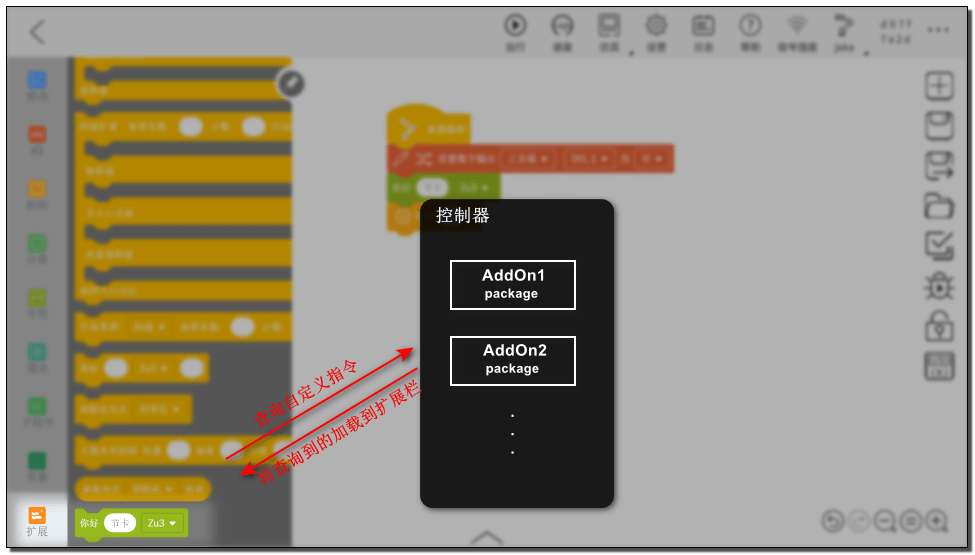 App 启动时,会从 AddOn 包中寻找自定义指令块的数据。如果找到,则会将该指令块加载到程序-扩展栏中。