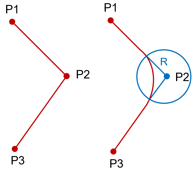 - 円弧で通過は、円弧で通過させたいポイントでのみオンにするだけで済みます。例えば上図では、ポイントP2でのみ円弧で通過をオンにするだけで済みます。