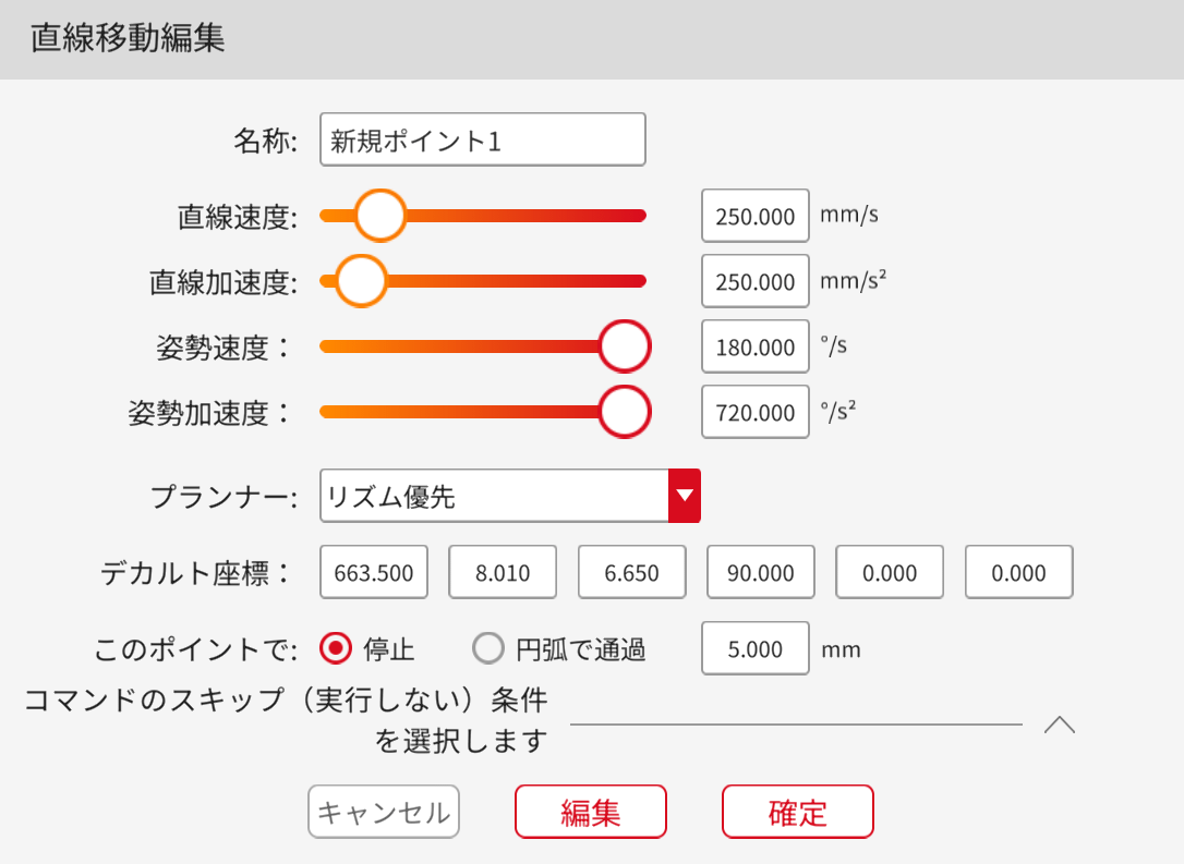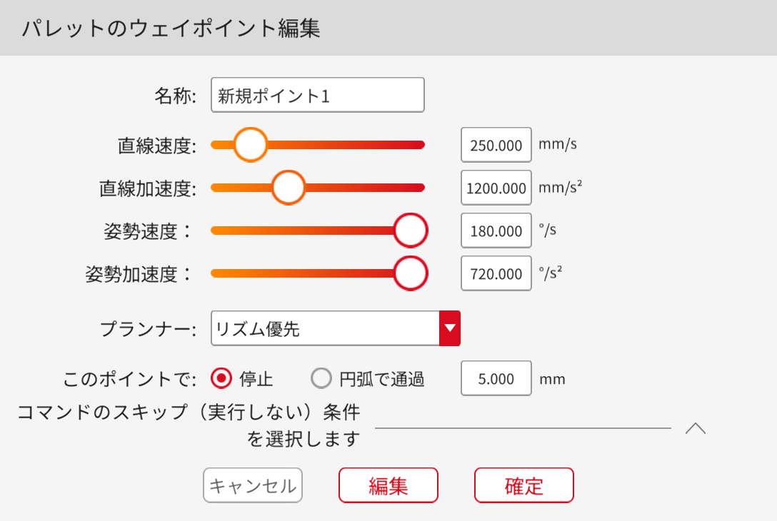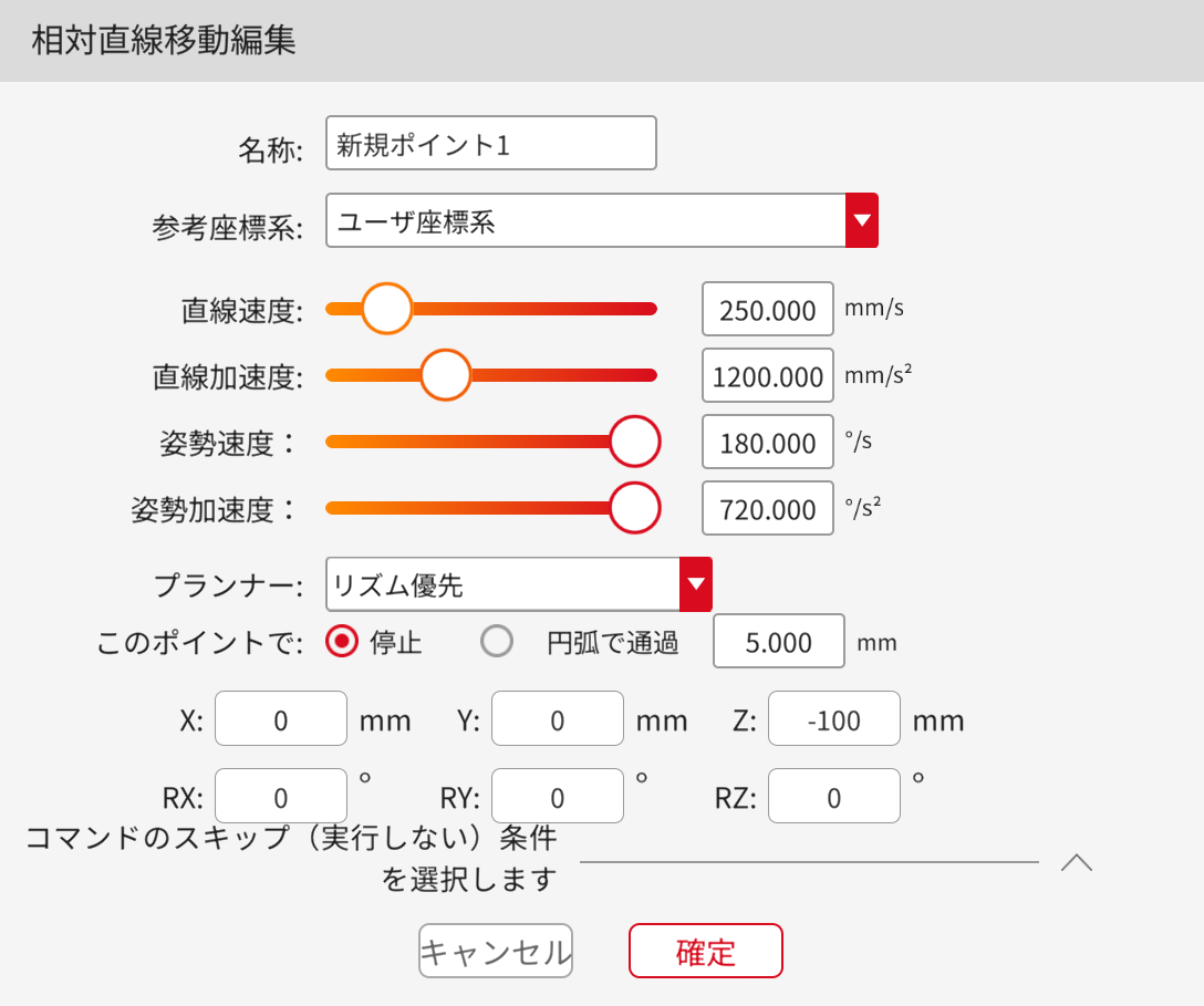 使用法:コマンドをクリックして設定画面に入り、コマンド名、速度、加速度の編集、ここで停止するか円弧で通過するかの選択、停止条件の選択、ティーチングポイントの編集を行えます。(このコマンドはパレットコマンド内にある場合のみ有効となります。)