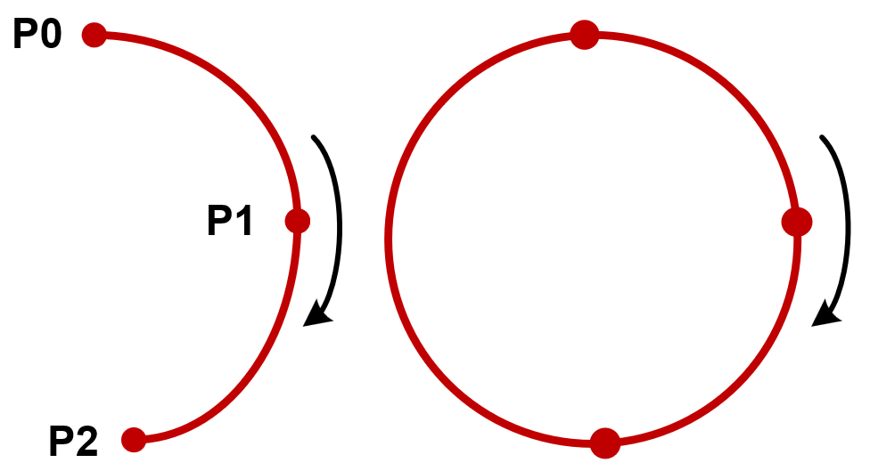 円弧移動を実行するには、P0、P1、P2の3つのポイントが必要です。P0は前のコマンドの最後のポイント、P1は円弧移動コマンドの最初のポイントで、P2は円弧移動コマンドの2番目のポイントです。