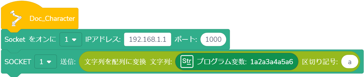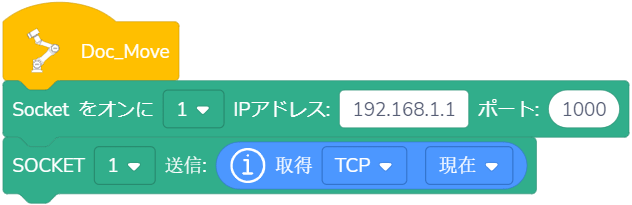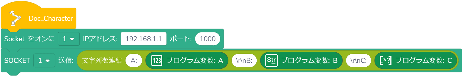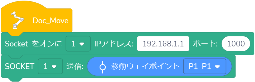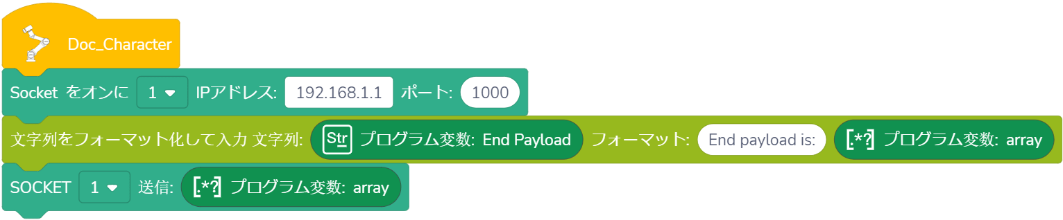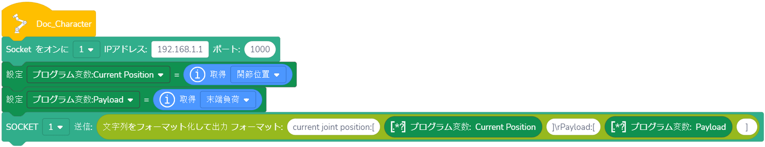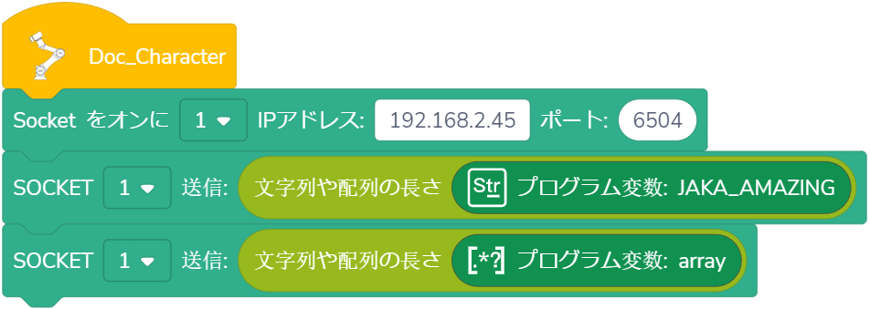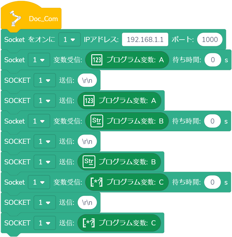 使用法:ドロップダウンリストから指定されたSOCKET IDを選択し、受信したい変数のタイプをドラッグし、変数が()秒以内に受信される、または受信されないが待ち時間が()秒を超えた場合、プログラムは実行を継続します。(待ち時間が0秒に設定された場合、ロボットは条件が満たされるまで待ち続けます。)Unicode文字を含む変数名には対応していません。