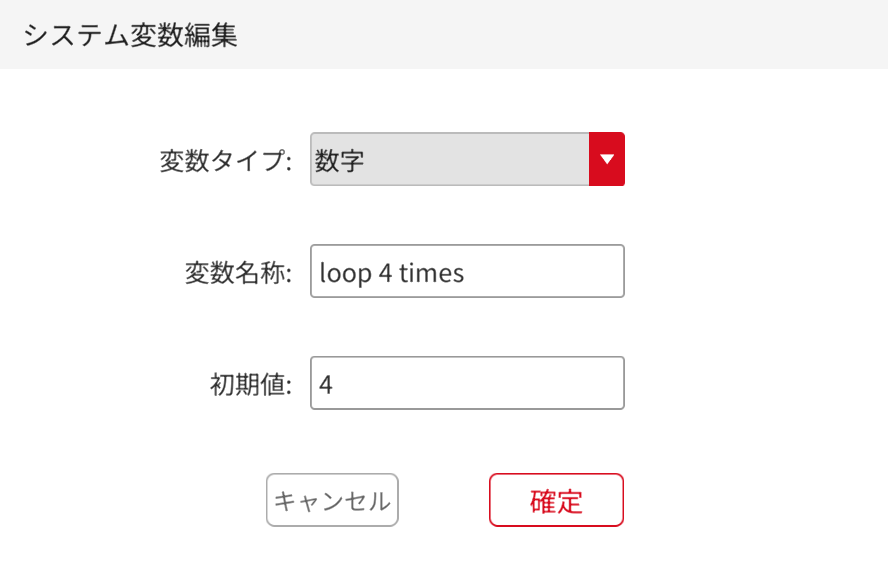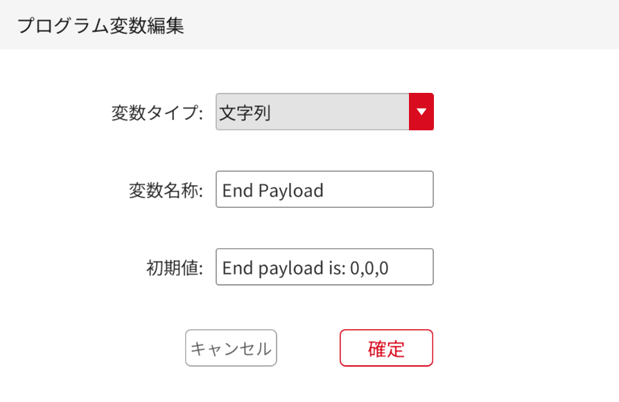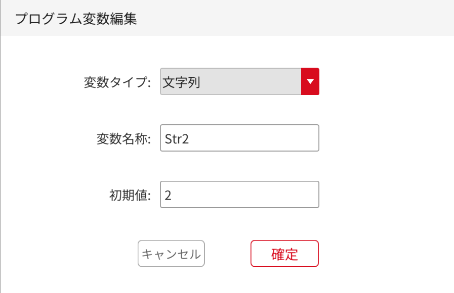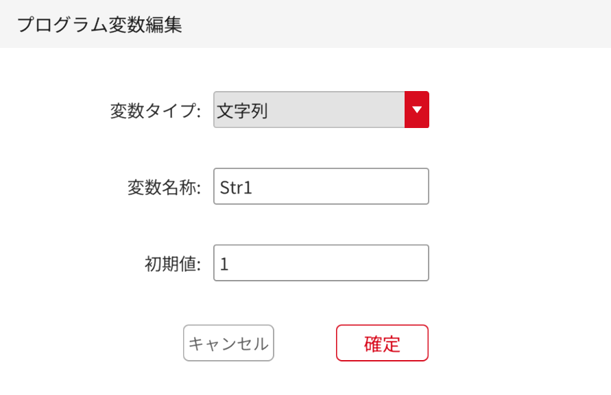 ![]() | 変数パラメータの編集 | 変数コマンド欄またはプログラム内で、編集したい変数ボックスをクリックして、変数編集画面に入ります。変数の編集が完了したら、メインプログラムで変数が正しく変更されていることを確認するため、メインプログラムを再度保存する必要があります。 |