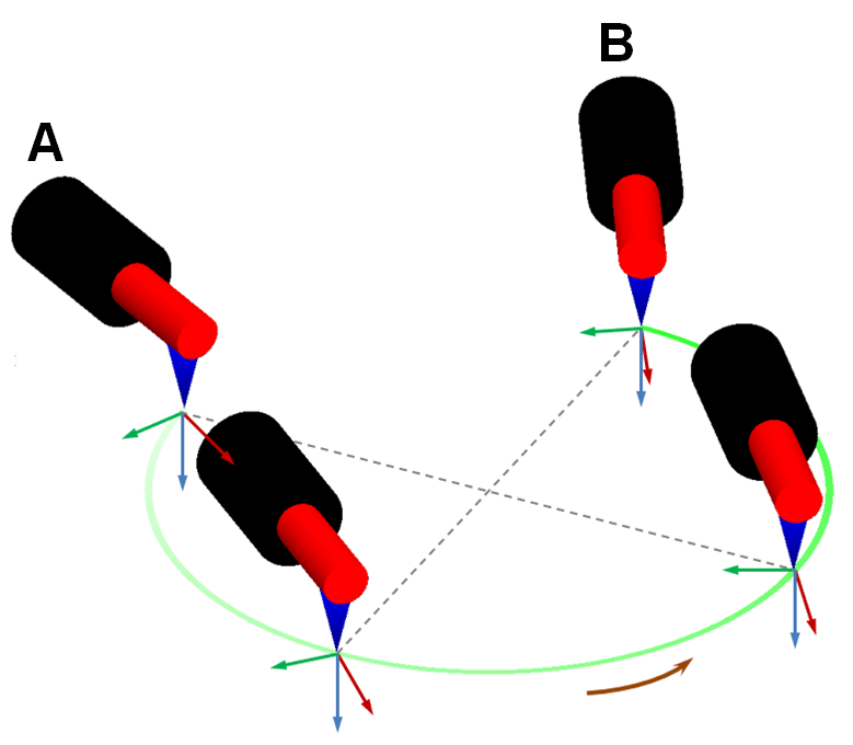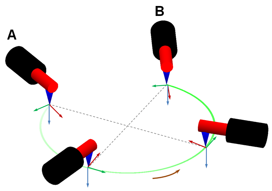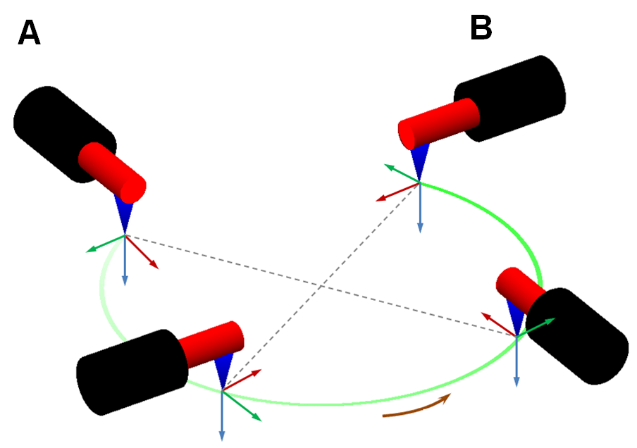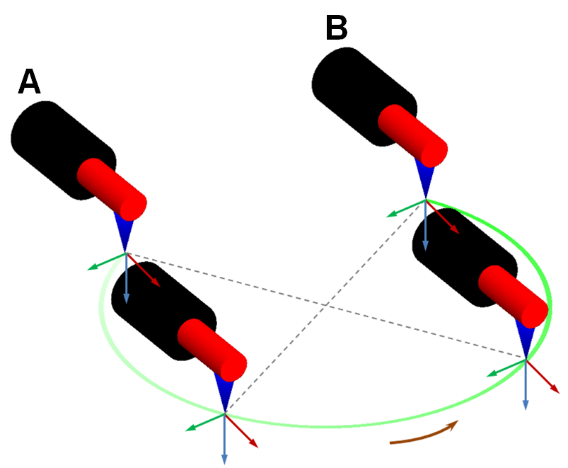 > A:初期ポイント B:エンドポイント - 初期姿勢と終点姿勢が同じ場合、ロボットの姿勢は変わらず、末端が常に円の中心を向かうことなく円弧移動を行います。