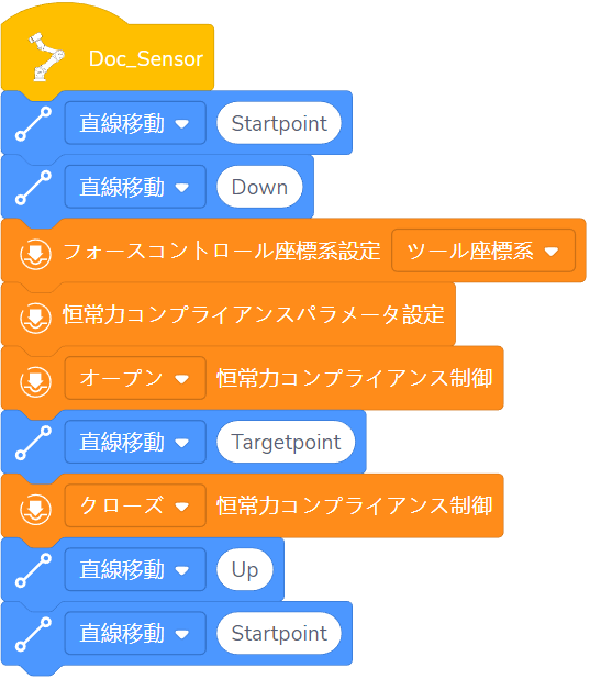 - 「定力制御の開始」と「定力制御の終了」の間の動作命令には直線運動を推奨し、高い力制御精度を達成するため、速度は 100mm/s 未満に設定することをお勧めします。