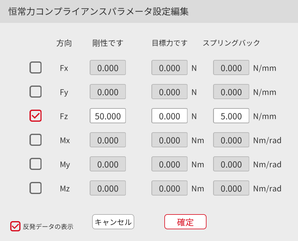 方法:恒常力コンプライアンス機能をオンにする必要がある方向を選択し、当該方向の剛性、目標となる力および反発を設定し、「反発データを表示」の前のチェックボックスにチェックを入れ、反発データのリストを表示します。デフォルトでは反発データは表示されません。