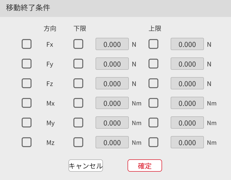 - 使用法:監視する方向にチェックを入れ、上限値または下限値を設定します。Fx、Fy、FzはX、Y、Zの3方向の変位に対応し、Mx、My、MzはX、Y、Zの3方向の回転に対応します。接触の外力は下限値未満または上限値を超えた場合に、移動終了条件が満たされたこととなります。この命令は、直後の動作命令を監視します。動作終了条件がトリガーされると、ロボットは監視対象の動作命令を直ちにスキップし、次の行の命令を実行します。