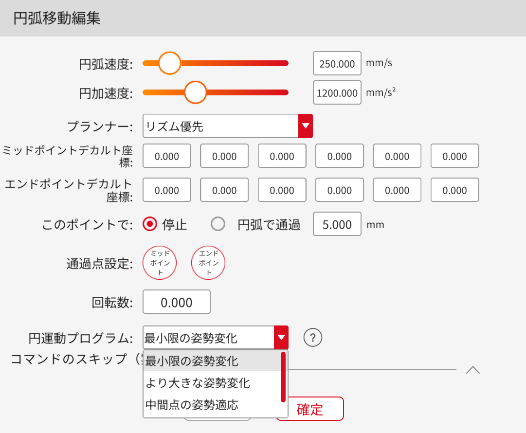 より大きな姿勢変化:初期ポイント姿勢、ミッドポイント姿勢、エンドポイント姿勢に基づき、姿勢変化が大きい円弧移動を行います。