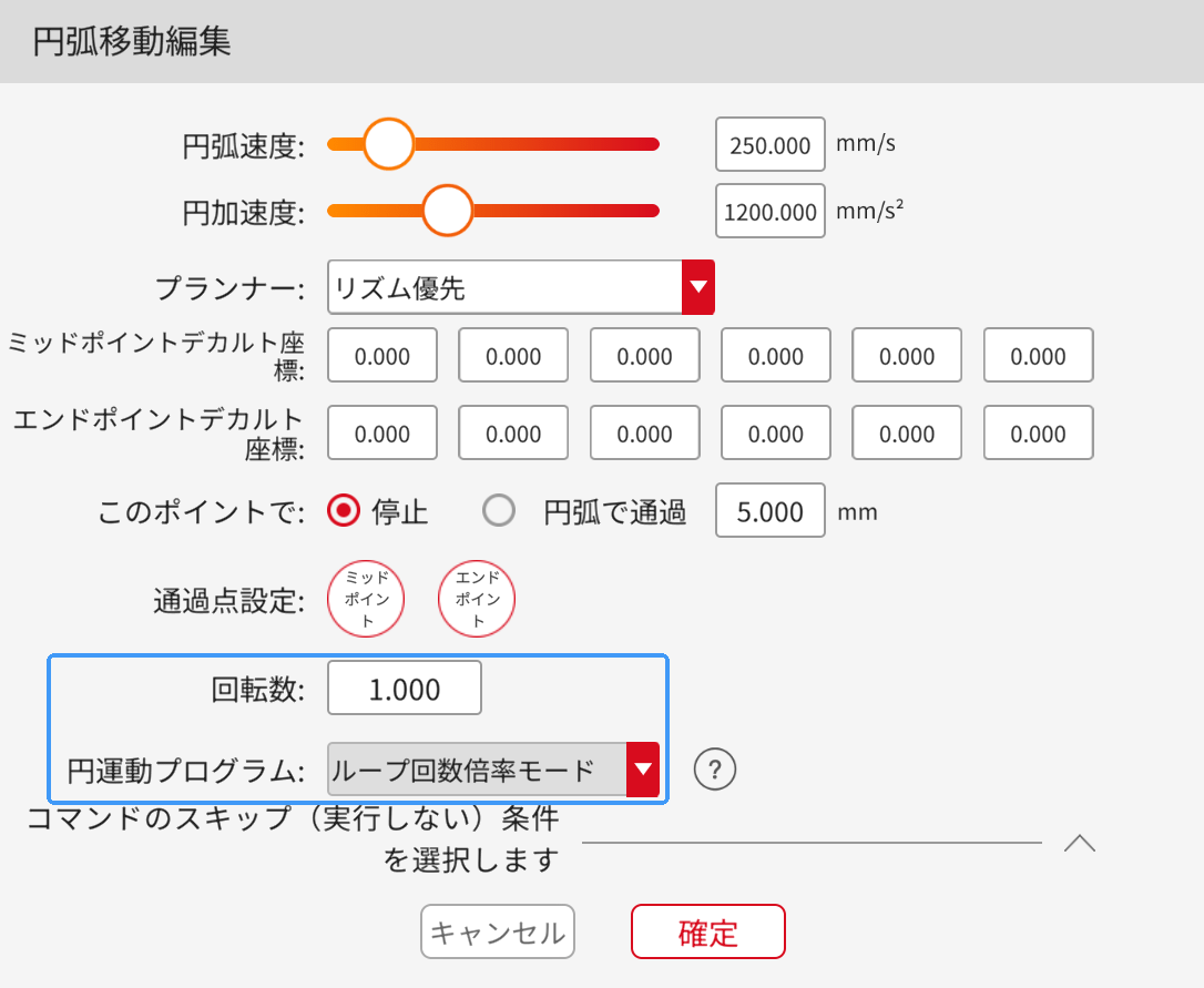 回転数:回転数が0の場合、円弧移動び軌跡は初期ポイントから終点までの円弧となります。回転数が1の場合、システムは自動的に回転数、通過点、終点に基づいて円を算出し、円弧移動の軌跡はシステムによって計算された1つの完全な円となります。回転数が2の場合、円弧移動の軌跡はシステムによって計算された2つの完全な円となります。他の状況も上記のように処理されます。