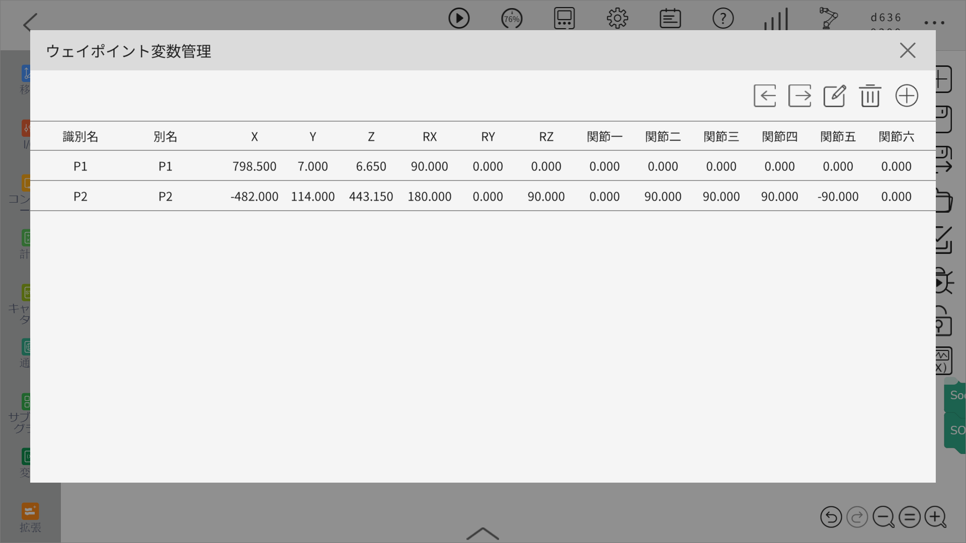 位置変数はロボットのデカルト座標と関節位置を設定するために使用でき、テキストボックスをクリックして直接入力するか、「編集」をクリックして手動操作画面に入り、ロボットを手動で制御することができます。