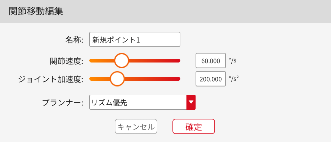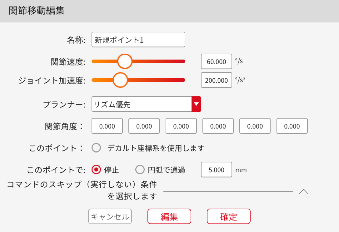移動ウェイポイントコマンドと組み合わせて、ロボットに関節移動または直線移動を実行させます。コマンドをクリックして、動作モード切り替え機能で関節移動または直線移動が切り替われます。コマンドをクリックして、編集画面に入り、コマンド名、速度、加速度を編集できます。