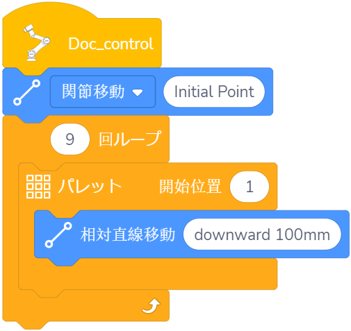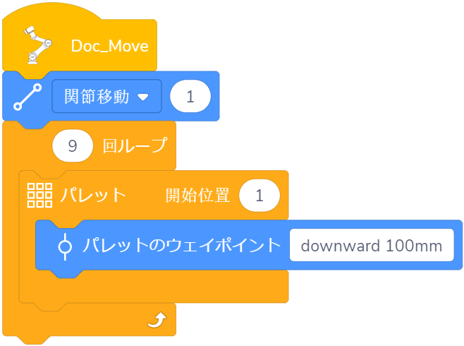 例:ロボットの末端が3×3の正方形のパレット上で移動し、各ポイントごとに100mm下方に移動します。