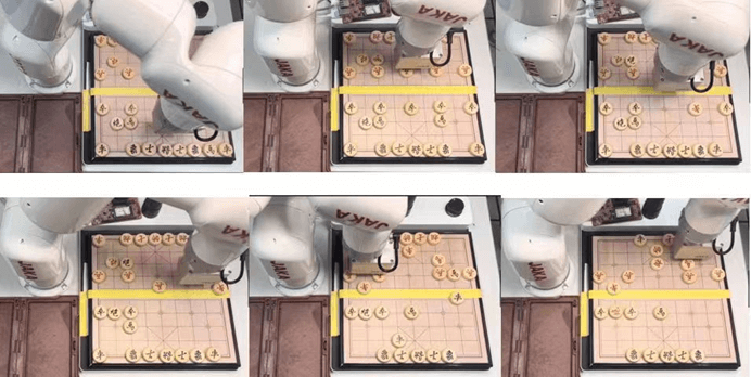 南京师范大学谢非教授团队开发了一款具有高研究价值和可二次开发升级的中国象棋对弈机器人,采用100%的国产化硬件实验平台,包括JAKA MiniCobo协作机器人、相机、嵌入式主控等各种硬件,软件方面针对棋盘识别定位和自主行棋策略两大模块进行了深入的研究与创新,提出了国内首创的China-chess-net深度学习模型,实现了棋子的精准定位和识别,可完成完整的全局对弈与残局对弈两种模式。在第四届中国研究生人工智能创新大赛中,经过激烈角逐,该系统荣获二等奖。