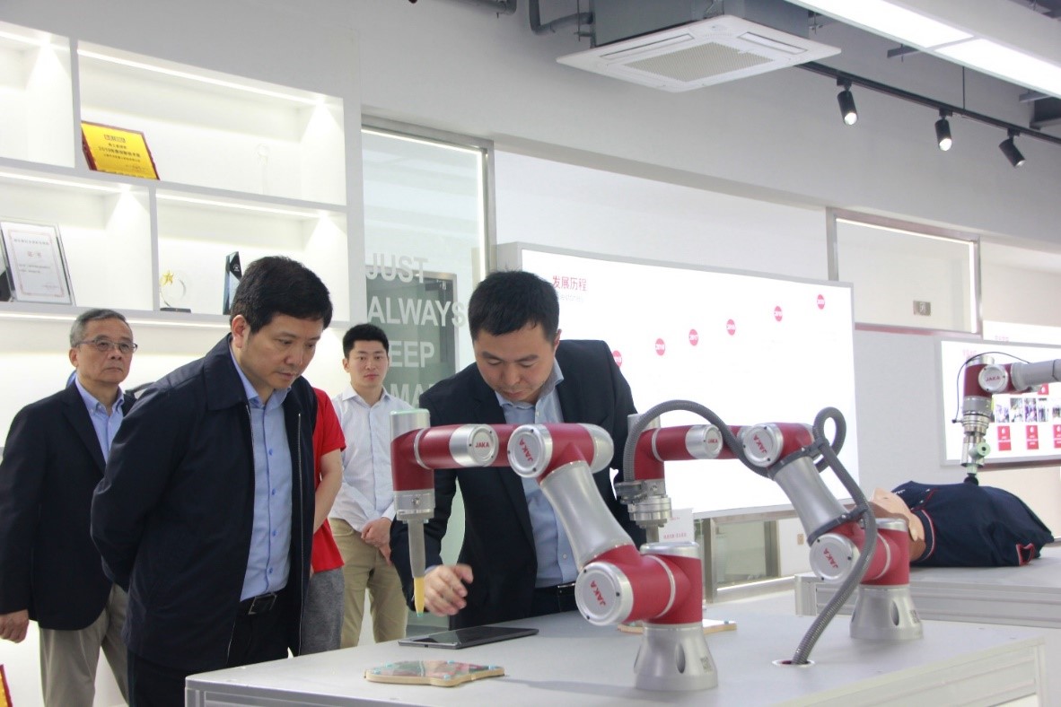 李明洋先生从公司的创新产品、科研项目以及全球化布局等方面向刘伟理事长一行作了详细介绍,并带刘伟理事长一行参观了节卡机器人“未来空间”展厅和节卡学院,深入了解节卡机器人的发展历程和智能协作机器人的研发成果。刘伟理事长对节卡机器人的科技成果转化、行业市场定位表示充分认可,在智能制造方面取得的成绩表示赞赏。