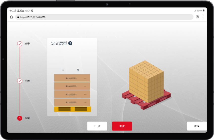 用户只需输入箱子、托盘等物料尺寸数据,移动箱体模型即可形成垛型,还可配合各种快捷操作按钮,快速调整垛型。