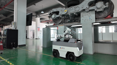 这款列车智检机器人,最小通过宽度仅600毫米,可直接进入检修股道,无需对现场进行土建改造。作业时,机器人自主定位导航、自动避障,从列车两侧同步检测,将6编组列车 “车底+车侧” 的巡检时间从100分钟压缩至60分钟内。