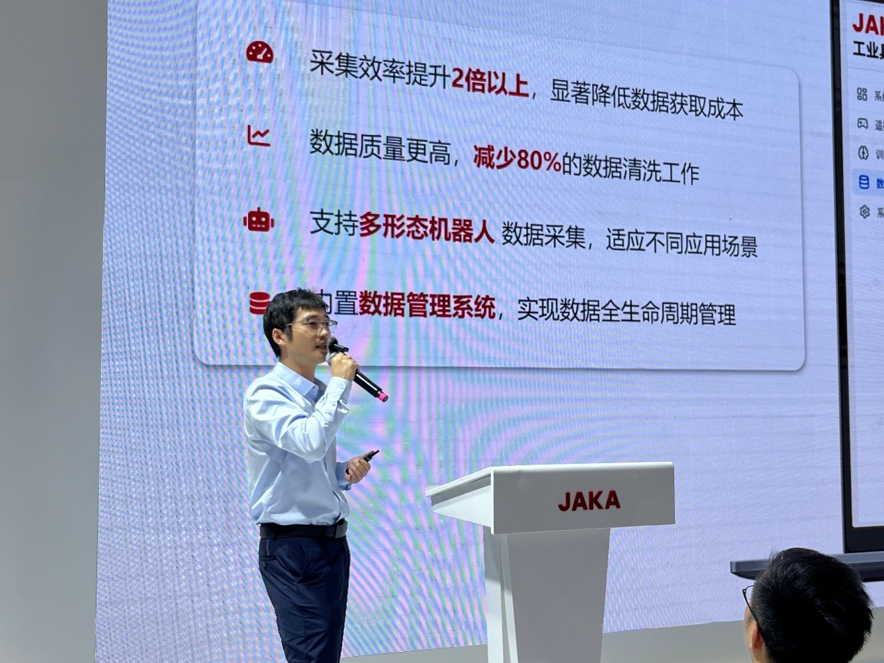 本次工博会,节卡机器人面向全球首发JAKA EVO 工业具身智能平台—— 作为全球首款 AI + 工业智能机器人操作系统,该平台提供标准化工业具身智能工具链,覆盖数据采集、增强、合成及模型训练、部署全环节。