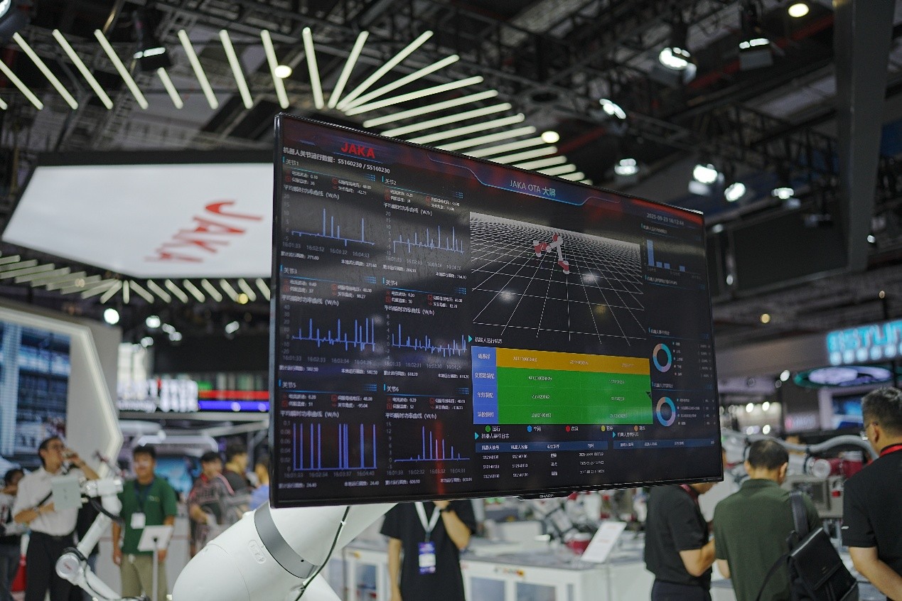 当JAKA 具身家族以参与“自动化”向“自主化”作业的工业场景变革,JAKA OTA智慧服务平台,让将节卡机器人产品的 “单点能力” 串联成 “群体生态”。工博会现场,JAKA OTA平台直观展示了包括JAKA MAX40在内的10台机器人的实时作业情况,及时丰富的数据采集与分析涵盖关节数据、机器人姿态、运行状态及异常事件等信息,实现基于大数据的精准预测性运维。